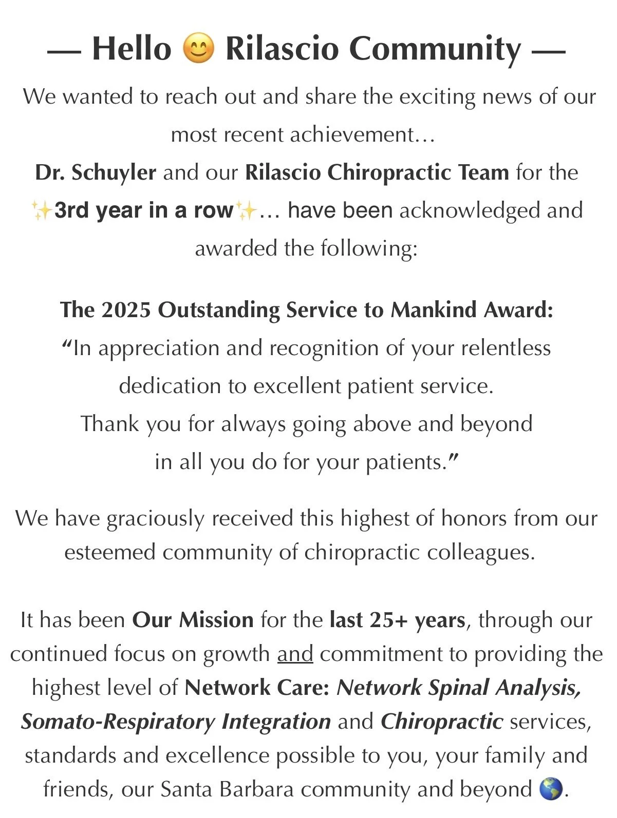Now.. When Dr Giovanna and I reflect on our Santa Barbara practice that was est. back in 2000… We are so grateful to say that Over the Years, 95% plus of Rilascio Chiropractic patients come directly and indirectly from referrals.. From people just like you!