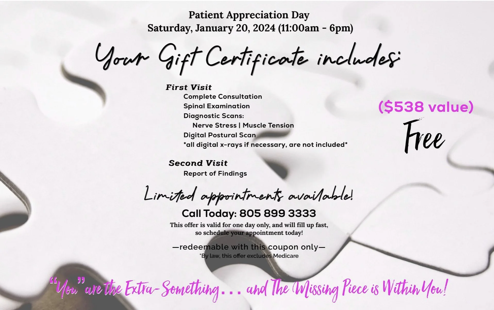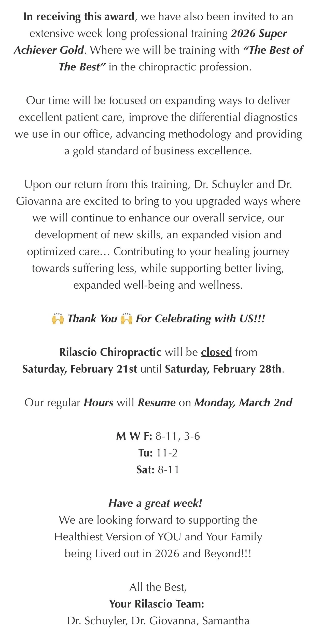 We have created a Special Event happening at Rilascio Chiropractic to acknowledge and appreciate our patients and our community. as a means of thanking you for your support and commitment to your health over the years…and the life, health and well-being of others.