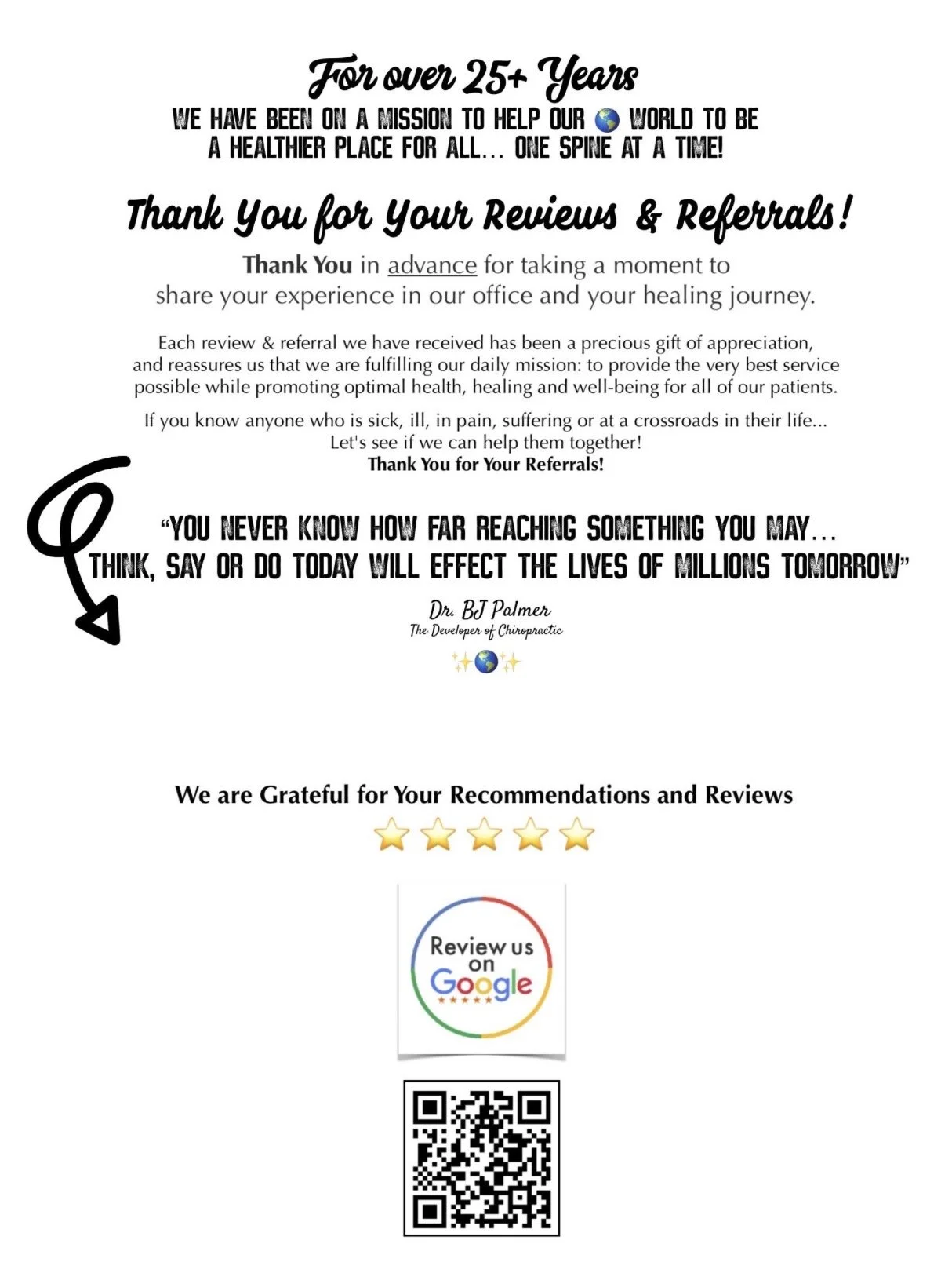 As we Individually reclaim our Personal Responsibility for how we are living on the “Inside” and treating ourselves and caring for ourselves… we now, become empowered knowing that we are proactively doing our part by Caring for and Optimizing the Functionality of our own Spine, Nervous System and Well-Being of our Body-Mind we are contributing and setting up our World to be a Healthier, Happier and Safer World for ALL.